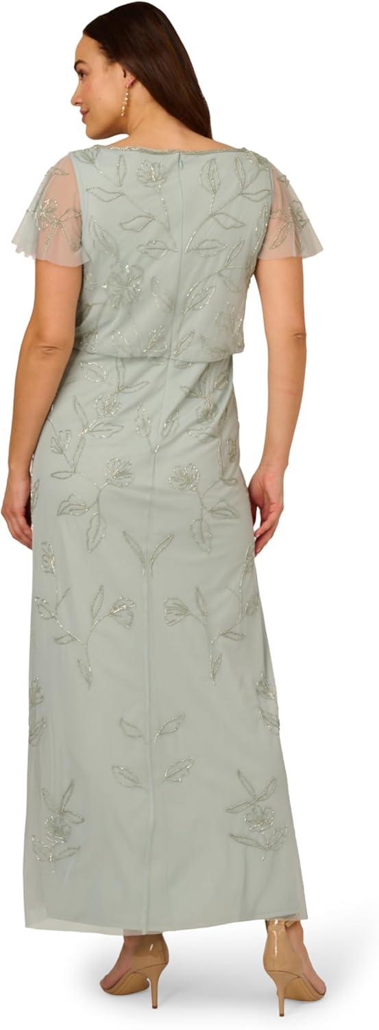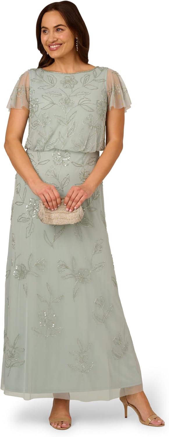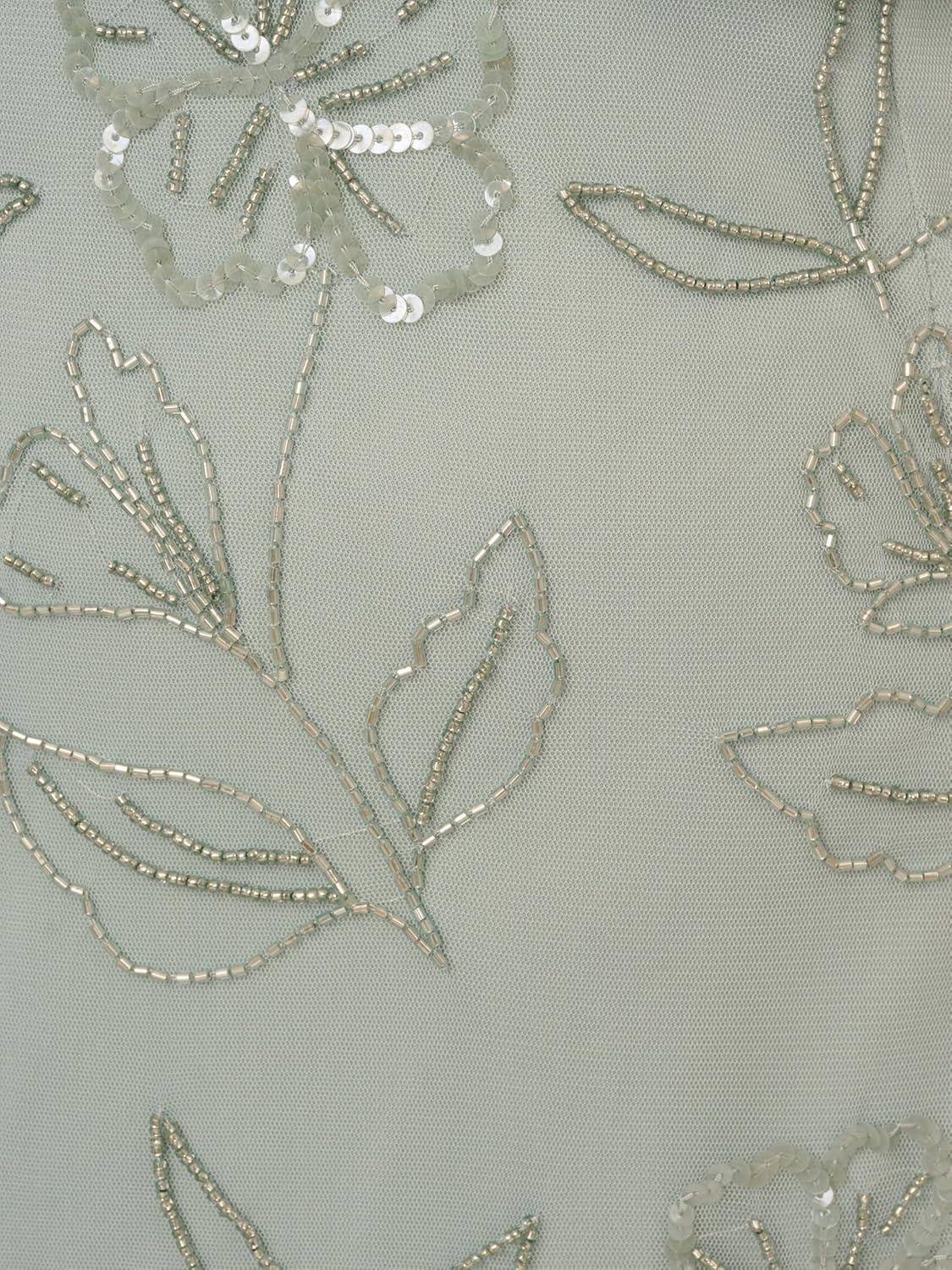 This is a soft skirt gown made out of beaded mesh fabric with V neck neckline and short illusion sleeves, blouson waist, and zipper at the center back