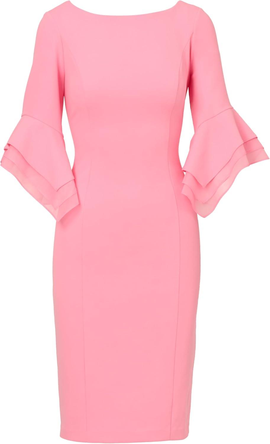 Dressed up meets versatile in this timeless sheath dress. This midi dress features a boat neckline, fitted silhouette through the body, and tiered three-quarter bell sleeves with organza accents. Crafted using knit crepe, this day dress has some stretch and no waist seam for a comfortable fit. A zipper back closure and a single pleat at the center back of the skirt hem completes the design.