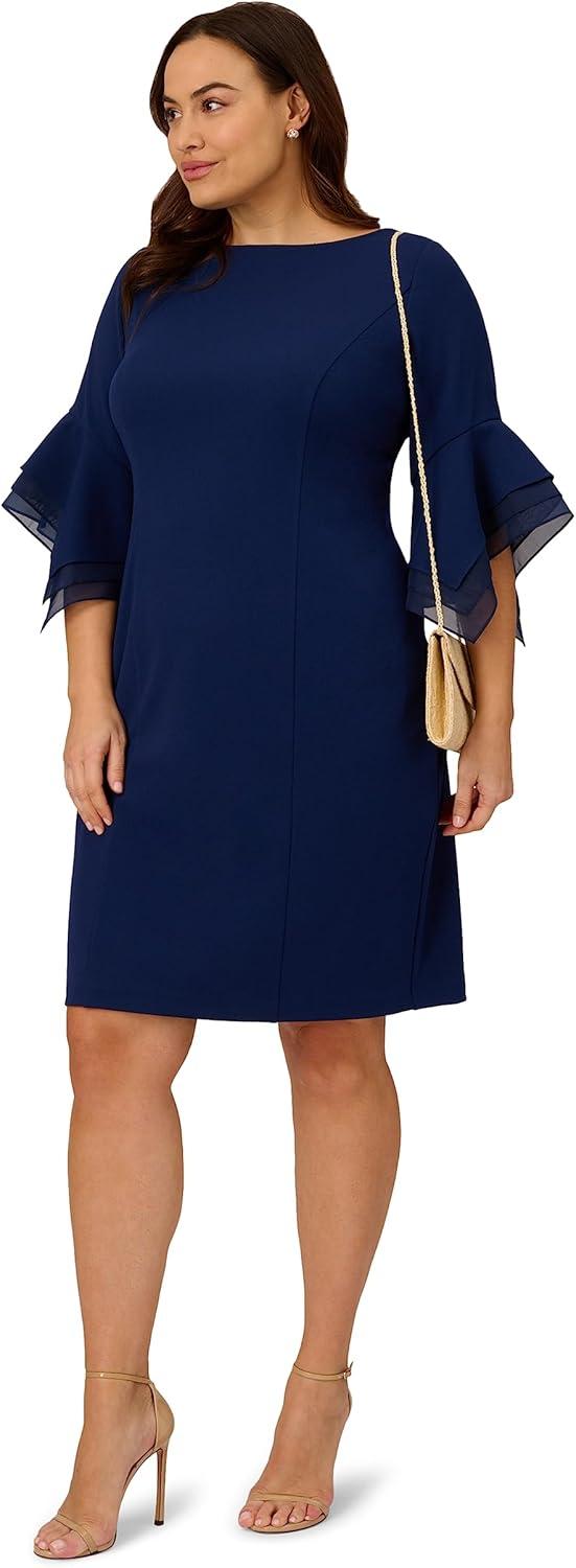 Dressed up meets versatile in this timeless sheath dress. This midi dress features a boat neckline, fitted silhouette through the body, and tiered three-quarter bell sleeves with organza accents. Crafted using knit crepe, this day dress has some stretch and no waist seam for a comfortable fit. A zipper back closure and a single pleat at the center back of the skirt hem completes the design.
