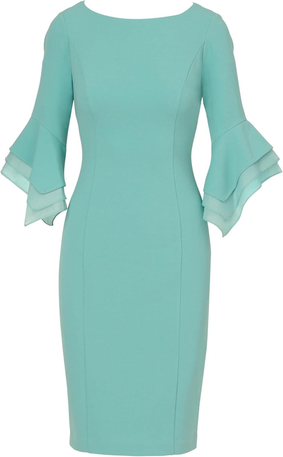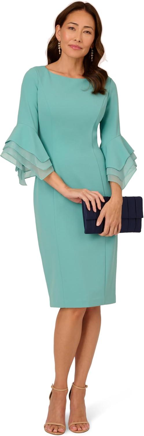 Dressed up meets versatile in this timeless sheath dress. This midi dress features a boat neckline, fitted silhouette through the body, and tiered three-quarter bell sleeves with organza accents. Crafted using knit crepe, this day dress has some stretch and no waist seam for a comfortable fit. A zipper back closure and a single pleat at the center back of the skirt hem completes the design.
