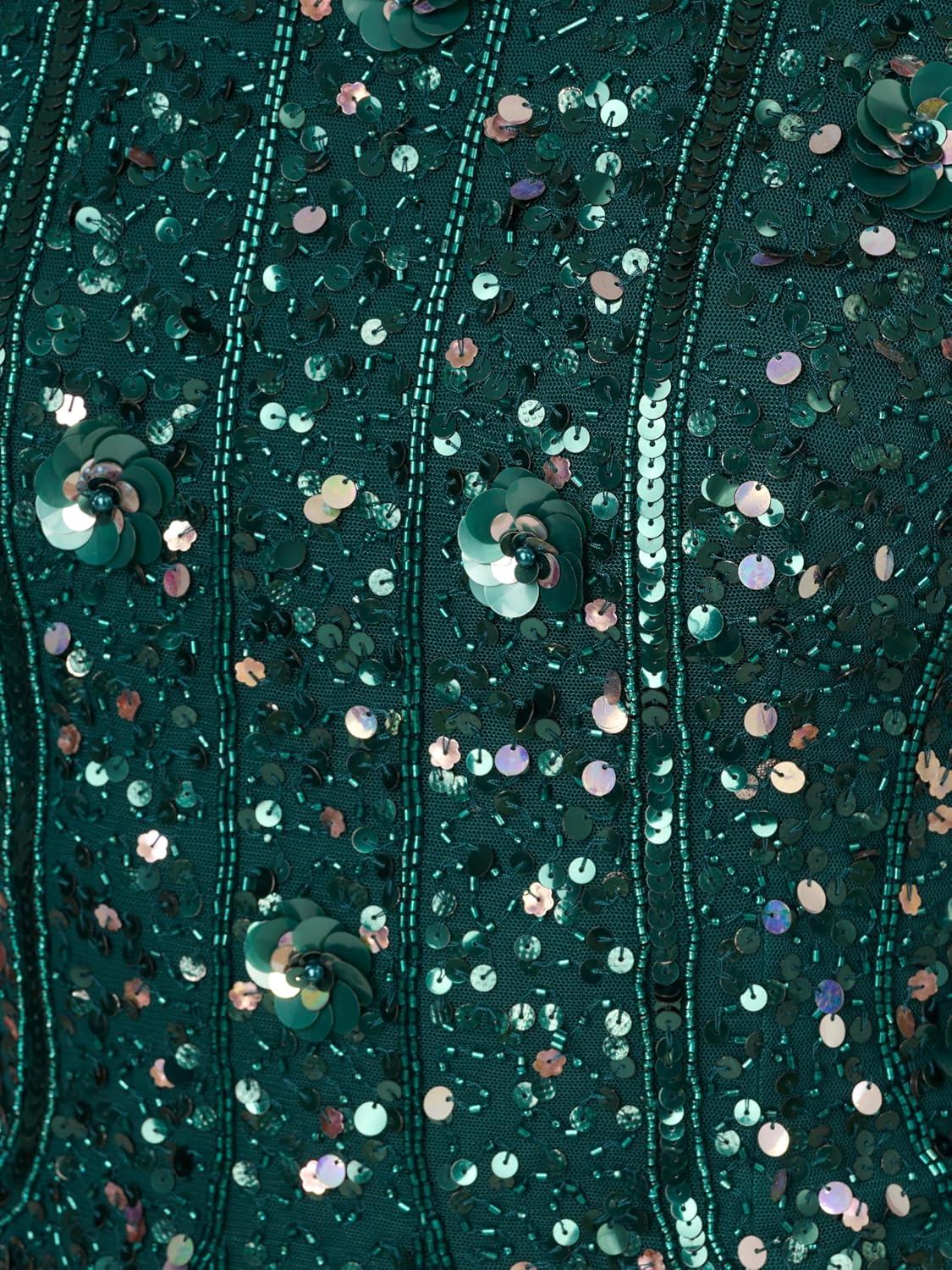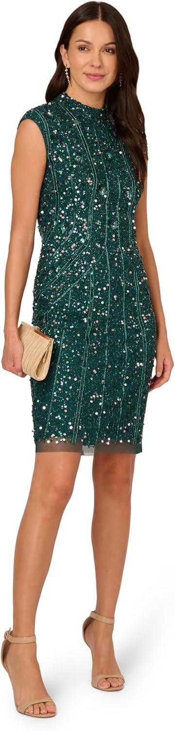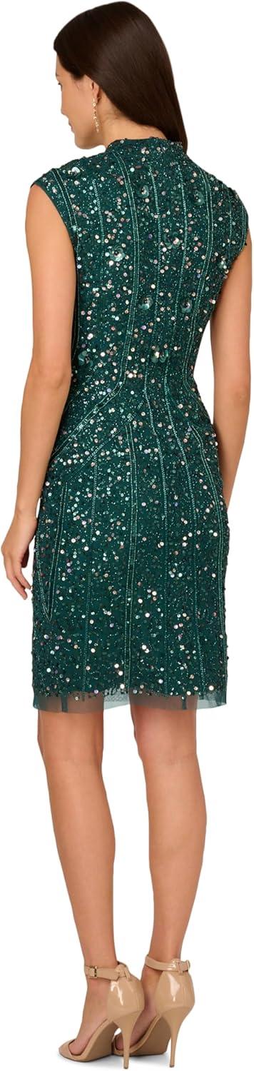 Opt for opulence in this short dress, adorned with shimmering sequins and beads that catch and reflect light with every movement. The chic mock neckline and elegant cap sleeves create a sophisticated silhouette for this cocktail dress. Crafted to catch the eye, with a convenient zipper closure at the center back ensuring a seamless fit, this dress is perfect for evenings that demand effortless elegance. Whether attending a cocktail party or a formal event, this sparkling party dress promises to dazzle and impress.