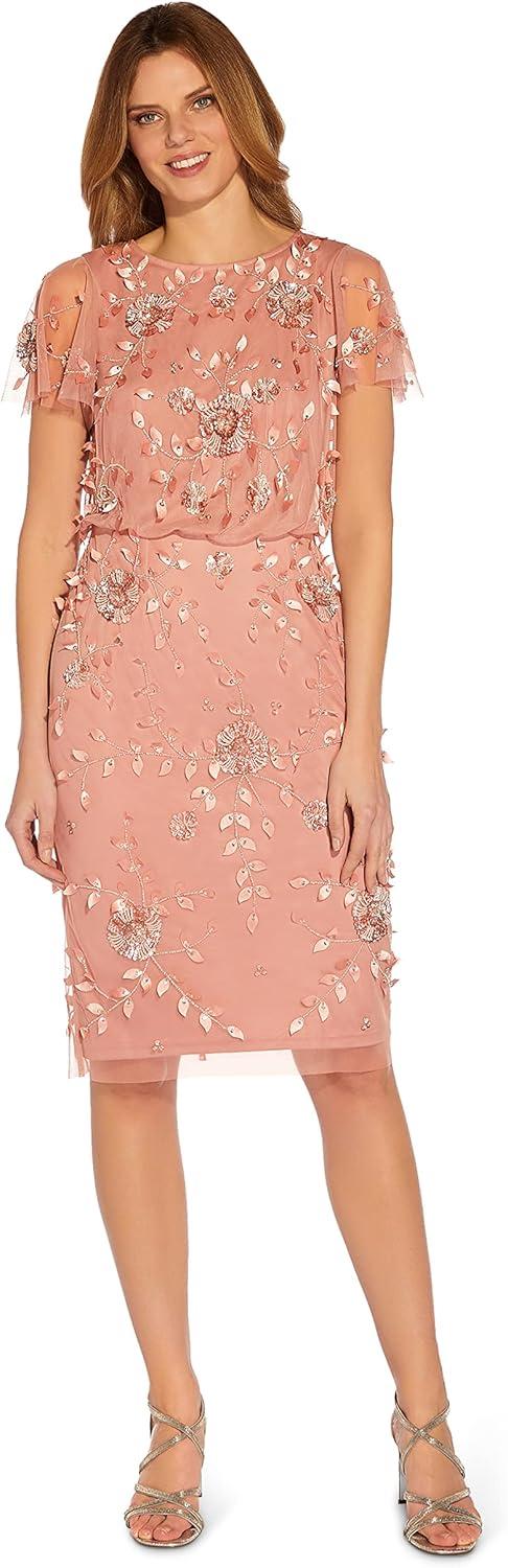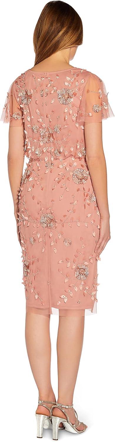 Add a touch of sparkle to your next party with our gorgeous midi sheath dress adorned with artfully placed handsewn beadwork in a floral pattern on a softly knit mesh. We love the iconic (and super flattering) blouson bodice which gently hugs your waist and then billows over it. All the details: sheer illusion flutter sleeves and sleek back zip closure. An easy choice for cocktail parties, wedding receptions and all your upcoming celebrations.