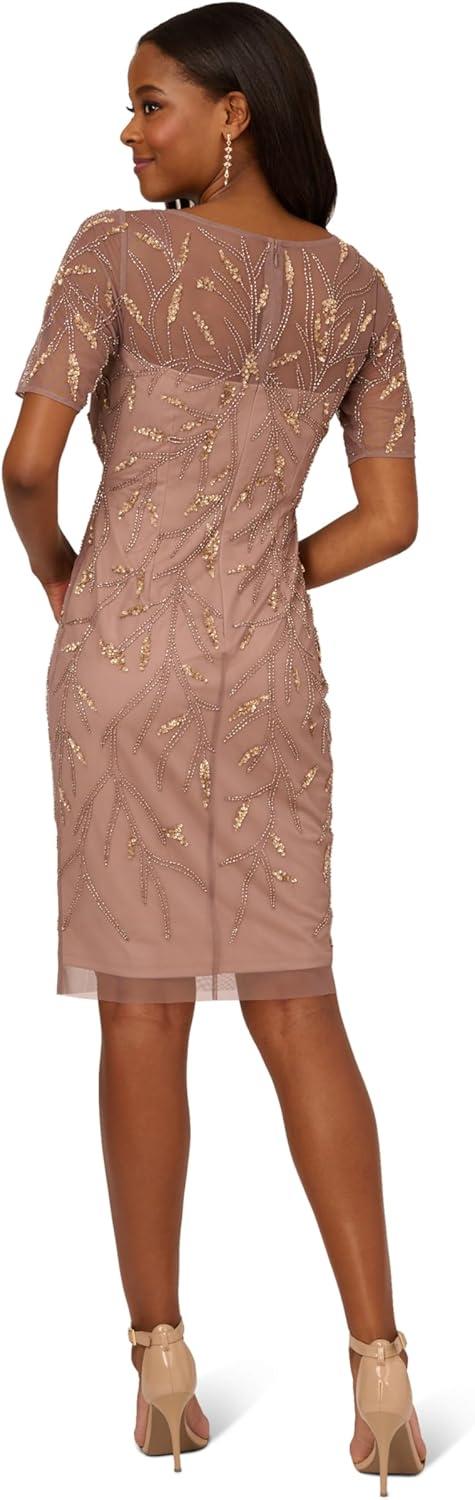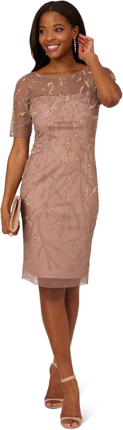Beauty in simplicity. Our stunning hand-beaded sheath dress, accented with streamlined long sleeves and subtle, shimmering pattern work. In a forever-trending and always elegant midi length.