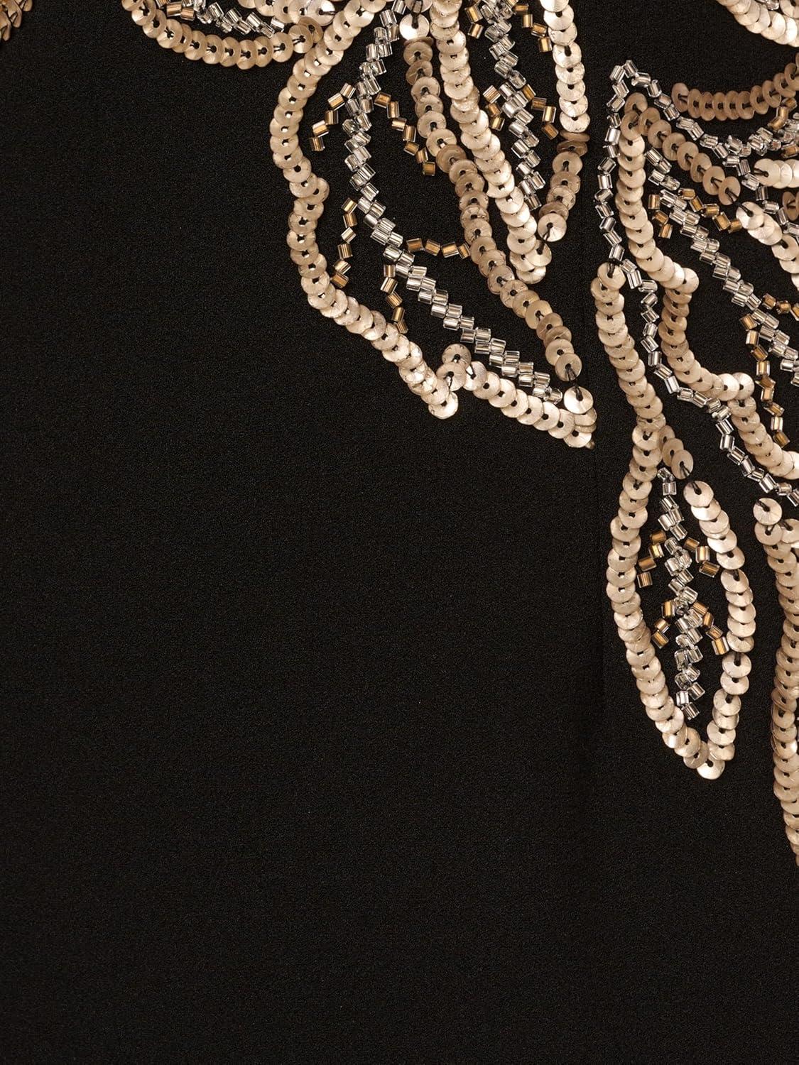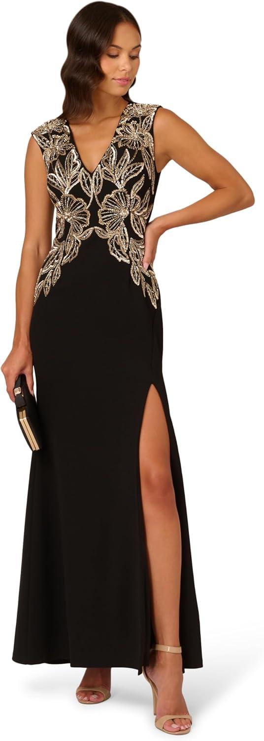 Lean into formal season with this sweetly beaded gown. This formal dress features a fitted bodice with boat neckline, a sheer yoke that gives a sweetheart neckline illusion, sheer flutter sleeves and a mermaid skirt with thigh-high slit. Crafted from crepe fabric through the body, thisdress has knit mesh at the bodice and sleeves that is embellished with beautiful sequin beaded florals. A hidden zipper closure at the sheer v-back completes this black-tie dress. Styled with neutral accessories that let the floral beading shine, this flutter short sleeve gown is a romanticlook.