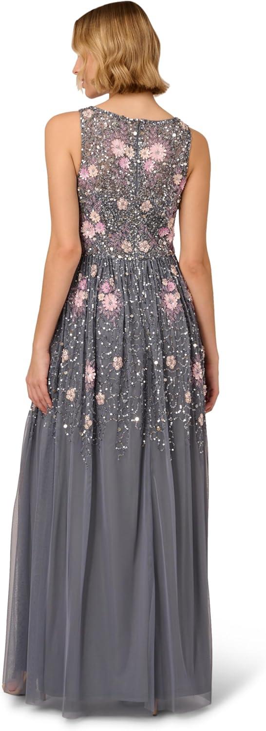 Adrianna Papell Women's Beaded Mesh Long Dress(Dusty Blue Multi)
