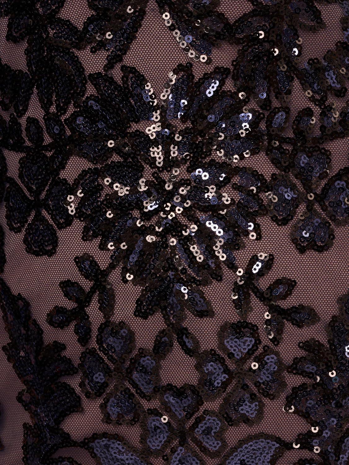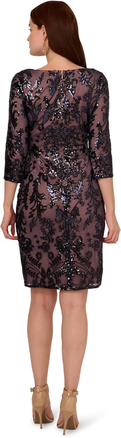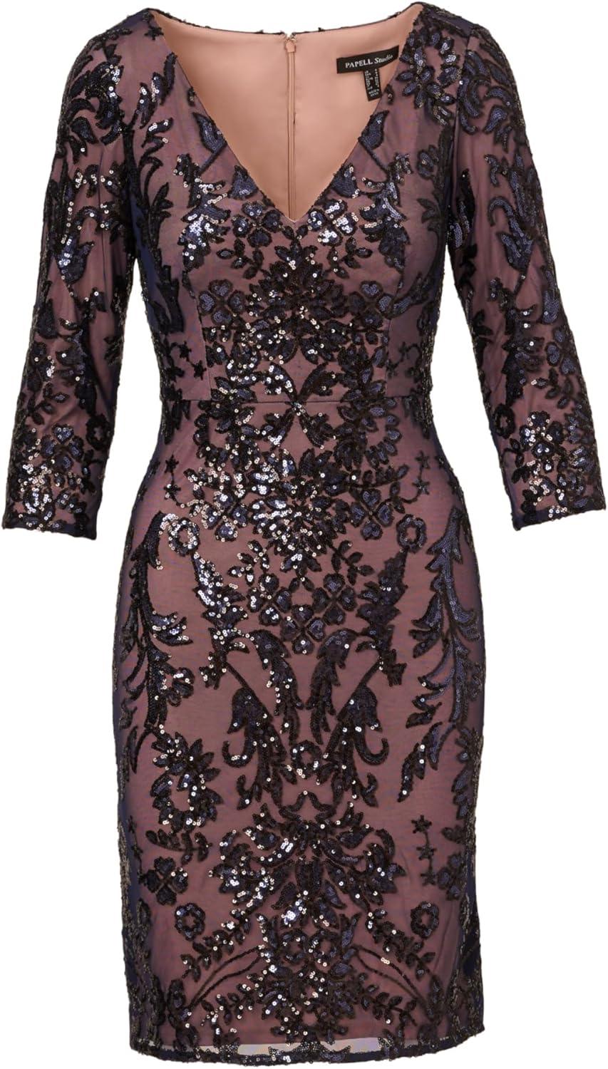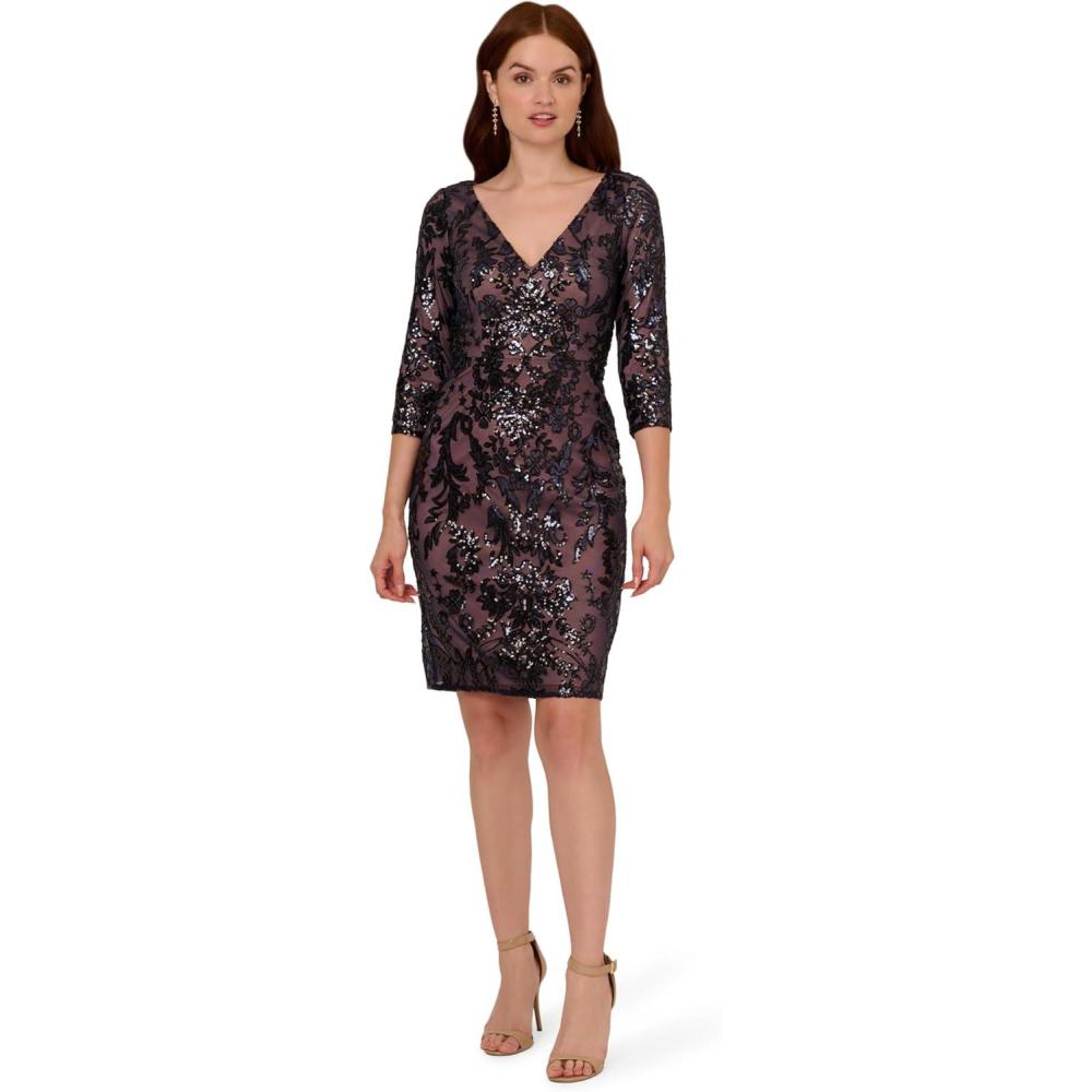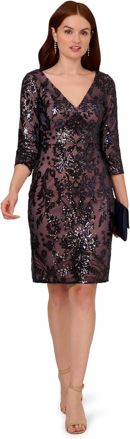 Dress to dazzle when you go out in this floral sequin dress. This cocktail dress features a fitted bodice with v-neckline, three-quarter sleeves, and a sheath skirt. Crafted from luxe mesh fabric that lets the contrast lining shine through, this party dress is embellished with sparkling sequins in floral designs. This three-quarter sleeve dress has a slit at the back of the skirt for easy movement. A hidden zipper closure at the center back finishes the design. Style this sequin dress with nude heels and a clutch for a look that was made for a formal wedding or black-tie affair.