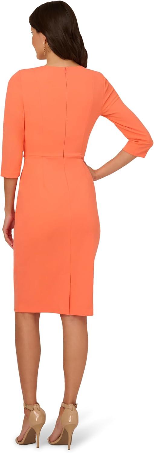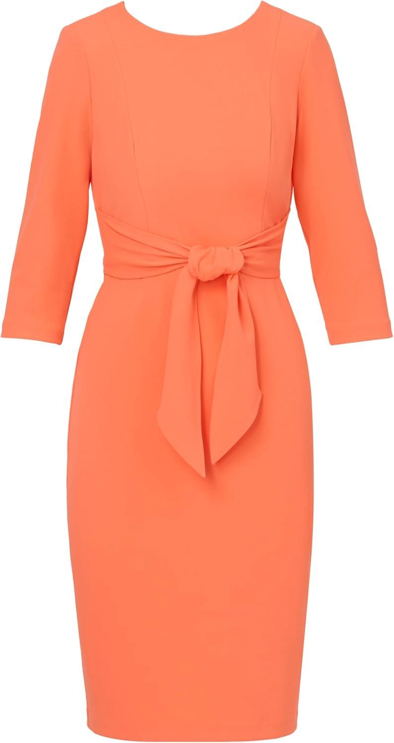 Modern yet sophisticated, this dress will make your day. This day dress features a boat neckline, three quarter sleeves, and a fitted sheath skirt. A self-tie bow at the waist accentuates the figure. Perfect from the office to bridal showers to brunch, this sweet midi dress is the picture of elegance for any event. Crafted from crepe fabric, this dress is partially lined and offers a zipper closure at the back. Add a clutch and stud earrings to complete this effortless dress.