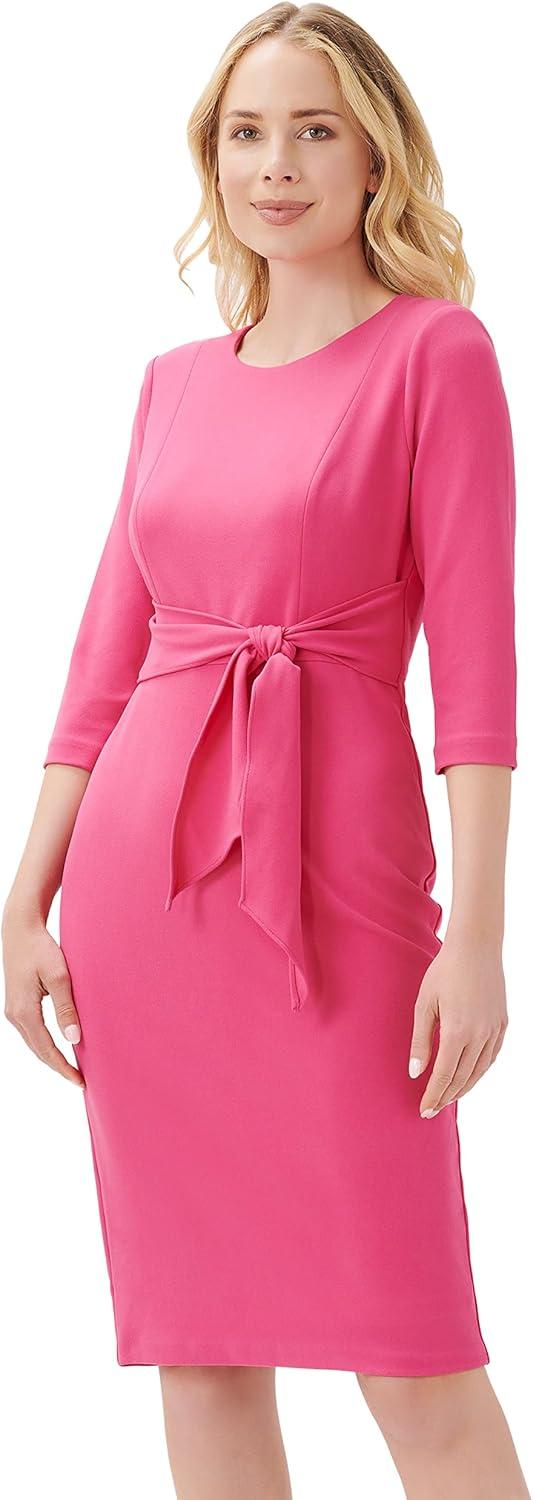 Modern yet sophisticated, this dress will make your day. This day dress features a boat neckline, three quarter sleeves, and a fitted sheath skirt. A self-tie bow at the waist accentuates the figure. Perfect from the office to bridal showers to brunch, this sweet midi dress is the picture of elegance for any event. Crafted from crepe fabric, this dress is partially lined and offers a zipper closure at the back. Add a clutch and stud earrings to complete this effortless dress.