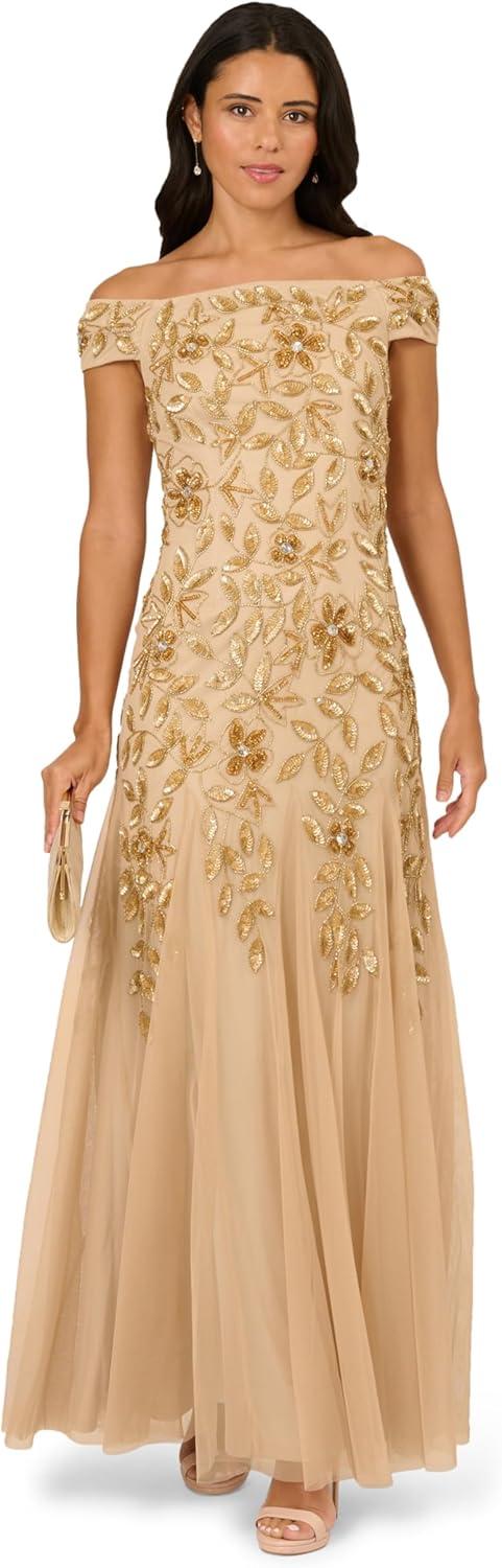 Adrianna Papell Womens Off Shoulder Bead Long Dress(Champagne Gold)