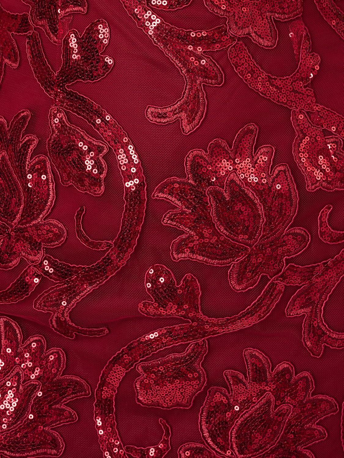 This beautiful but very wearable design contrasts a sleek sheath dress silhouette with textured and sparkling embellishments. Allover botanical embroidery set with shimmering sequins catches the light with every movement of the dress. The off-the-shoulder sleeves add amoment of romance with a back zipper securing the fitted design.