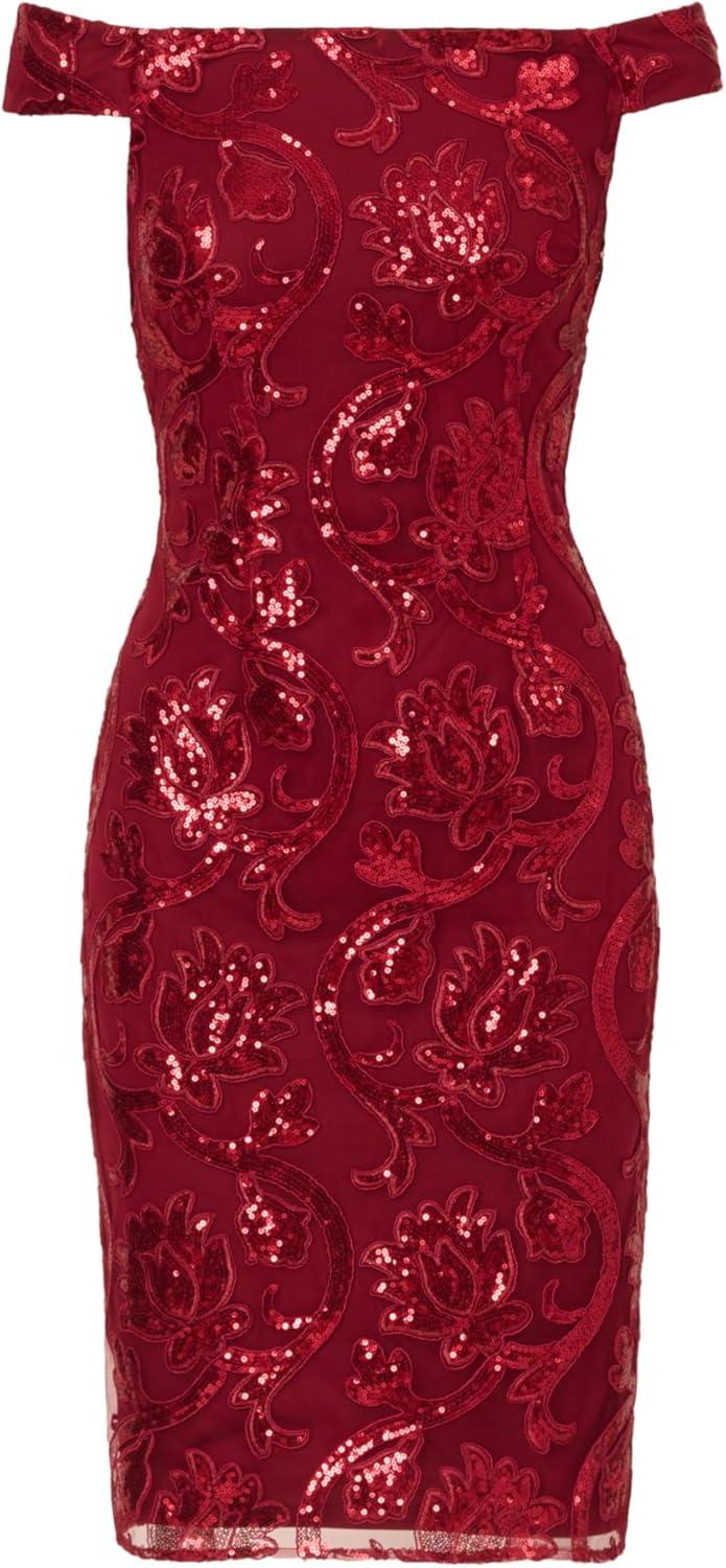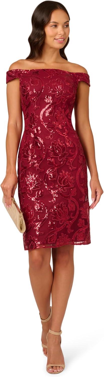 Adrianna Papell Women’s Off Shoulder Sheath Dress(Garnet)