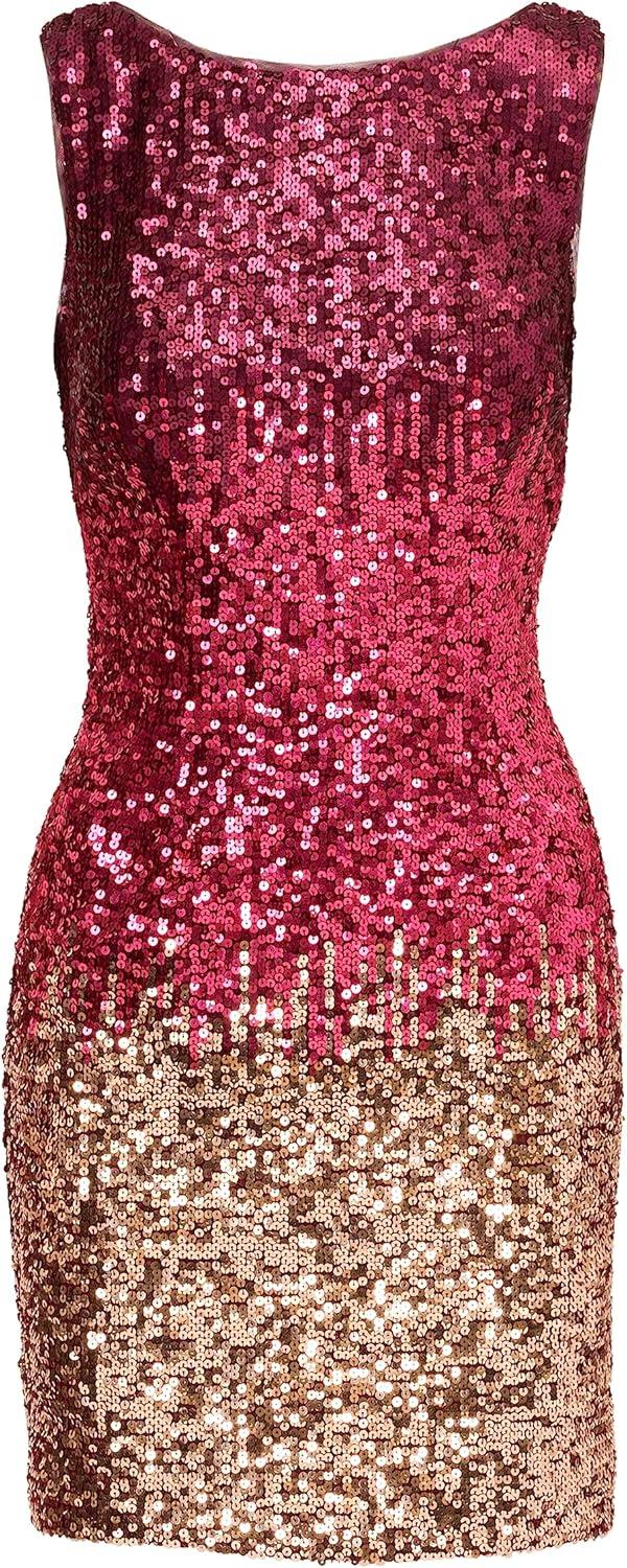 When the occasion calls for sparkle, reach for this sequin dress. This sheath dress features a sleeveless bodice, boat neckline, and deep v-back. Fully lined and crafted from knit mesh, this cocktail dress has been hand-embellished all over with ombre mini sequins. A zipper closure at the back is the final touch on this semi-formal dress. Step into a metallic heel and reach for bold jewelry in this short party dress.