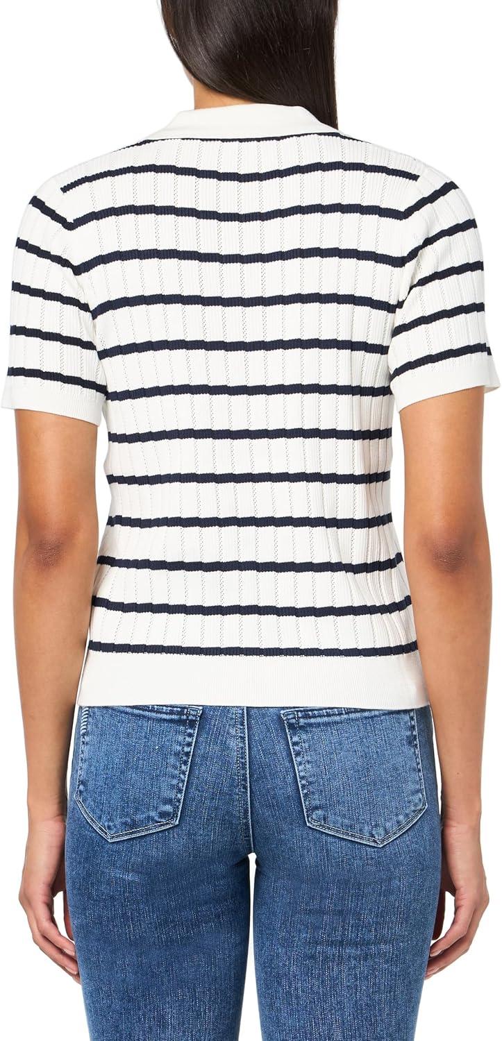 Adrianna Papell Women's Pointelle Short Sleeve Polo Striped V-Placket Sweater(Ivory/Navy)