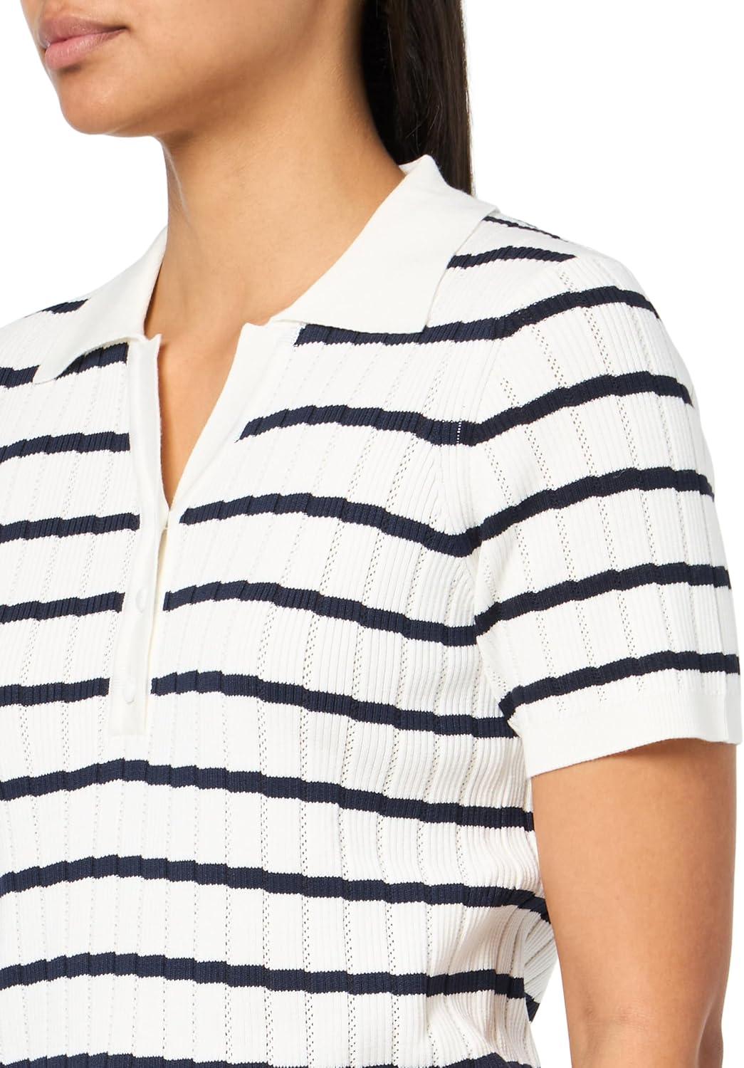 Classic design makes this polo sweater an elevated look. This shirt features a v-placket neckline with collar, short sleeves, and striped print. Crafted from pointelle fabric that lends beautiful texture, this short sleeve sweater is a polished look. Simply pull on and team with trousers for a day at work or style with straight leg jeans and sneakers for a preppy look.