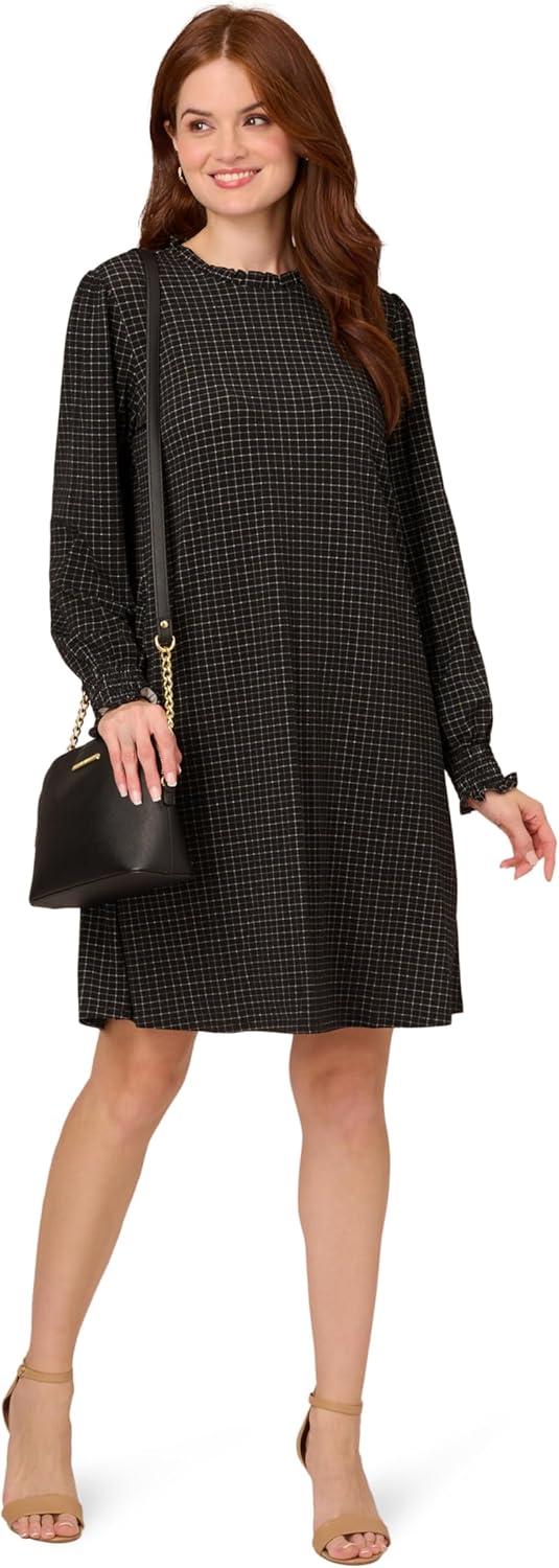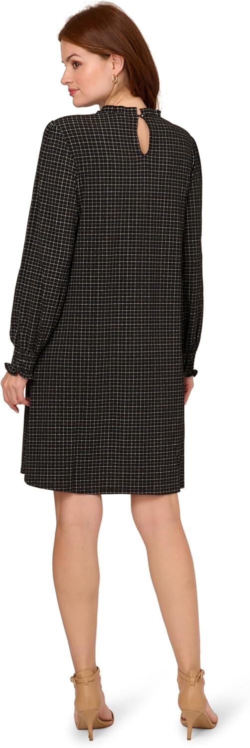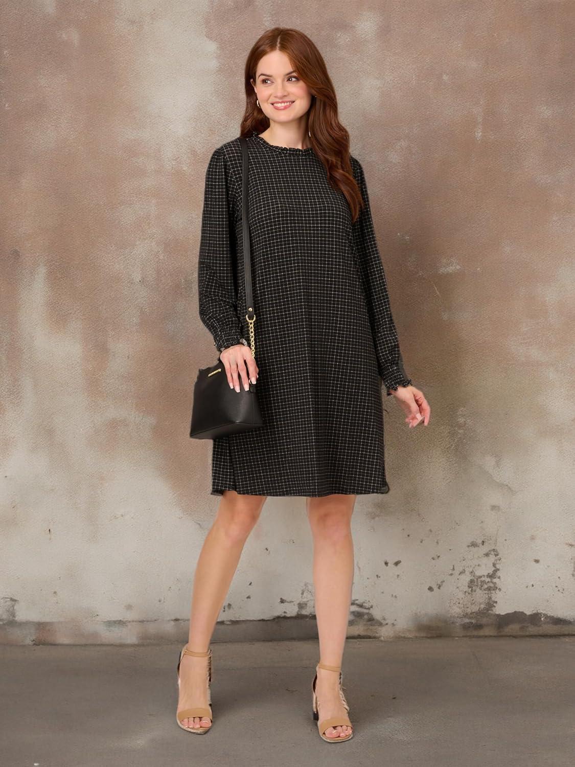 Youre going to love having this effortlessly cute dress in your closet this season. This printed dress features a high neckline, long sleeves, and a shift silhouette. Smocking at the neckline and sleeves elevates this shift dress. Crafted from knit fabric with a subtle checked print, thisdress is perfect for a day at work or weekend fun. Paired with tights and booties, this long sleeve dress will be an easy yet classic look.