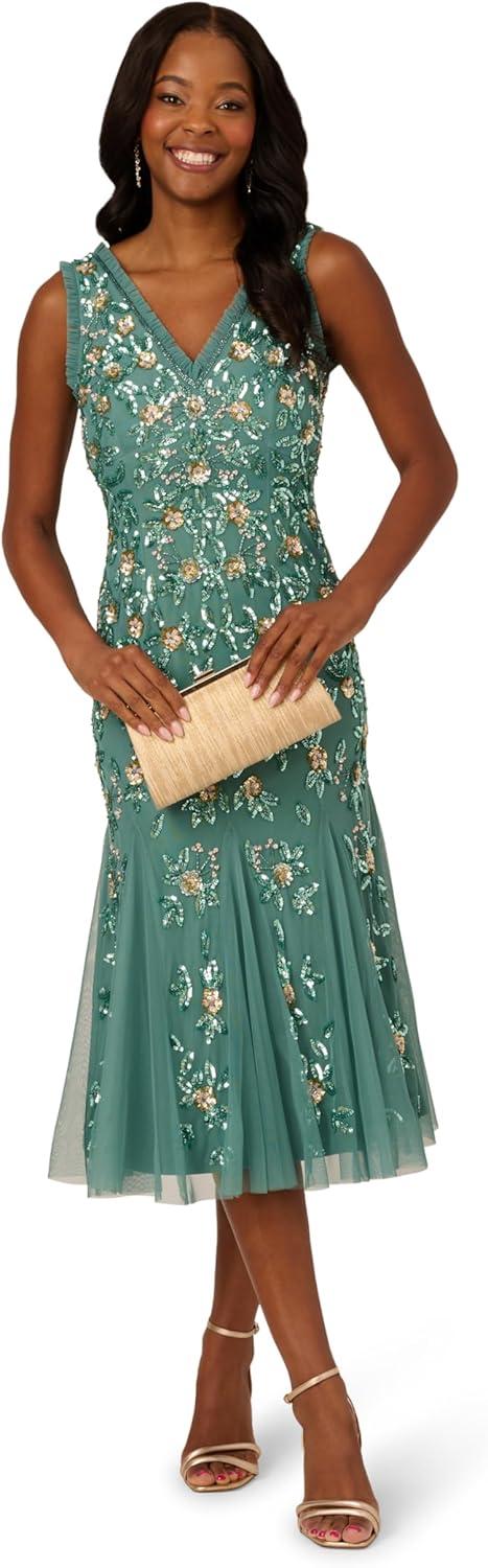 Adrianna Papell Womens Ruffle Bead Dress(Gem Green)