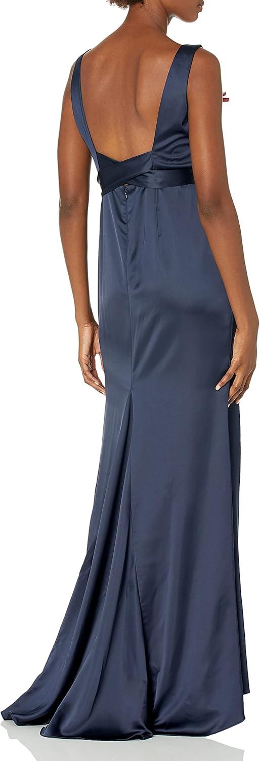 This light satin sleeveless faux wrap front bridesmaids dress features an open back with a bow sash detail.