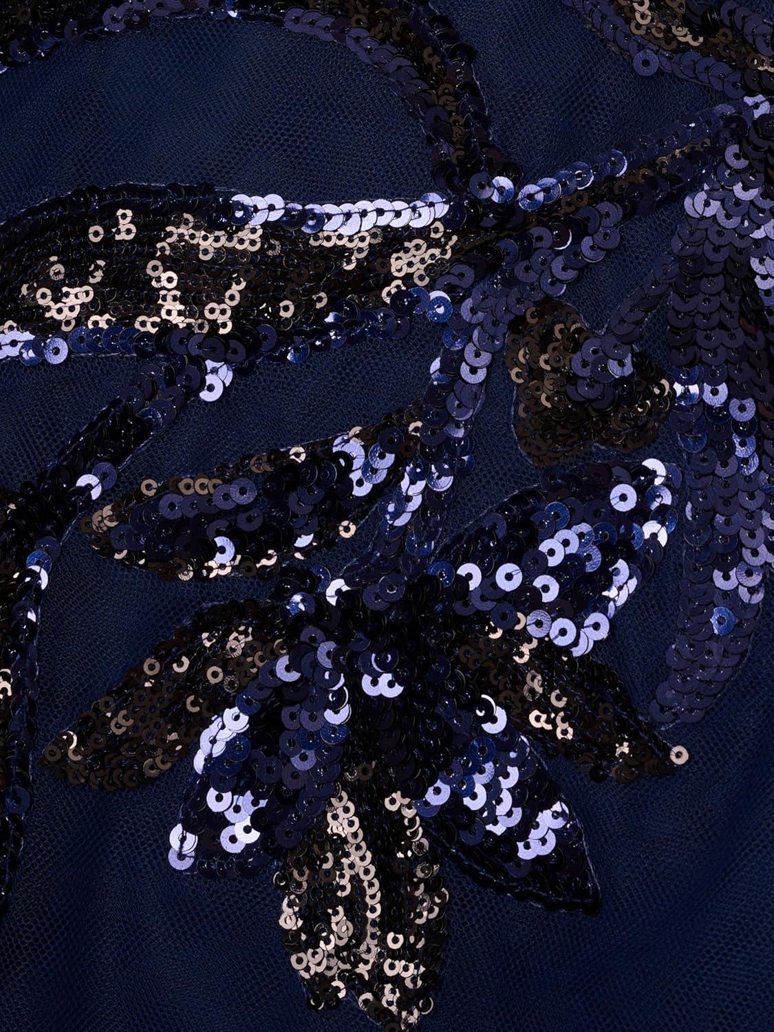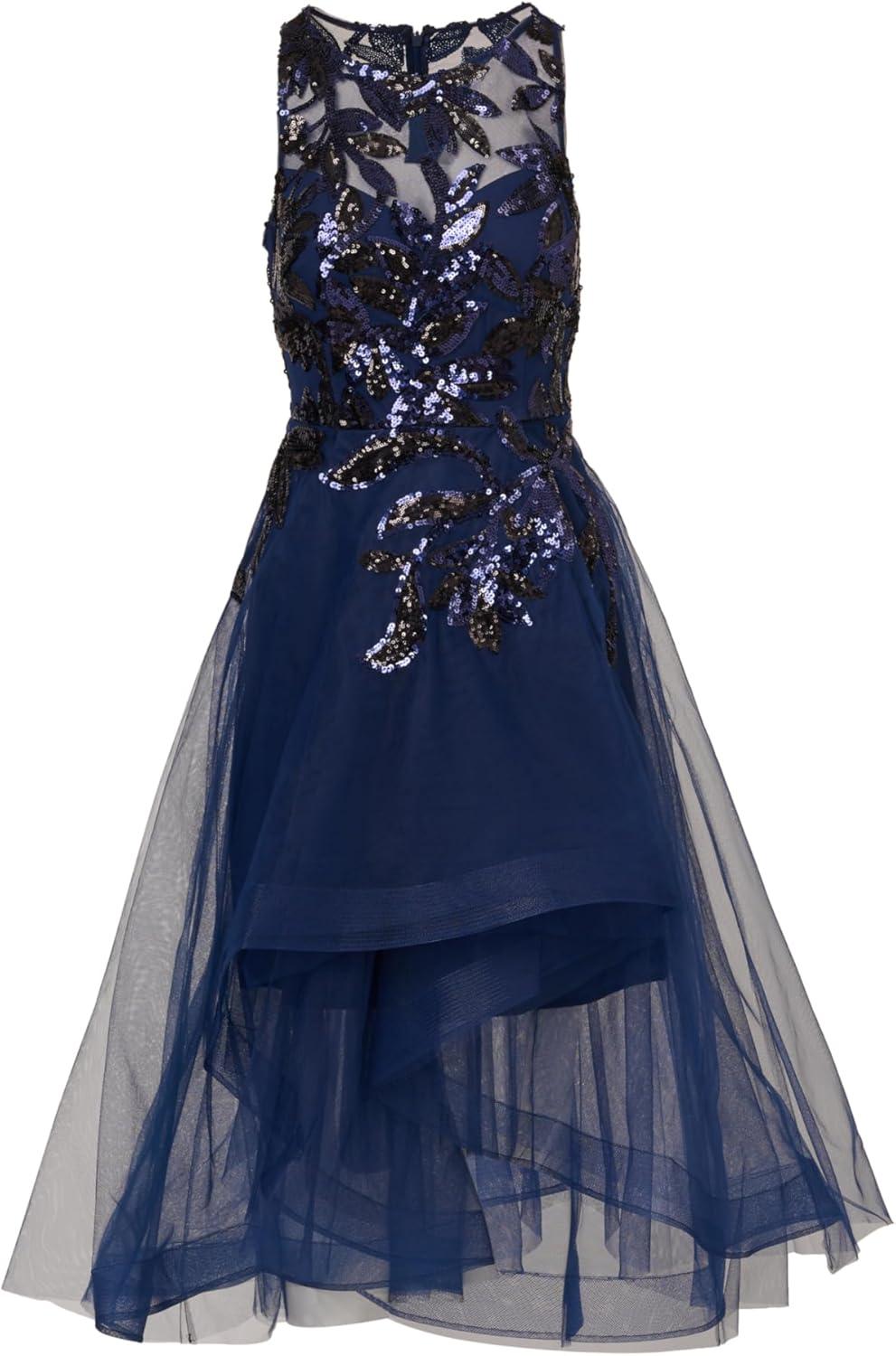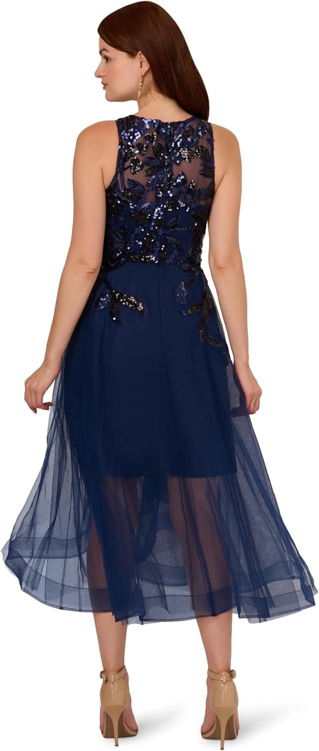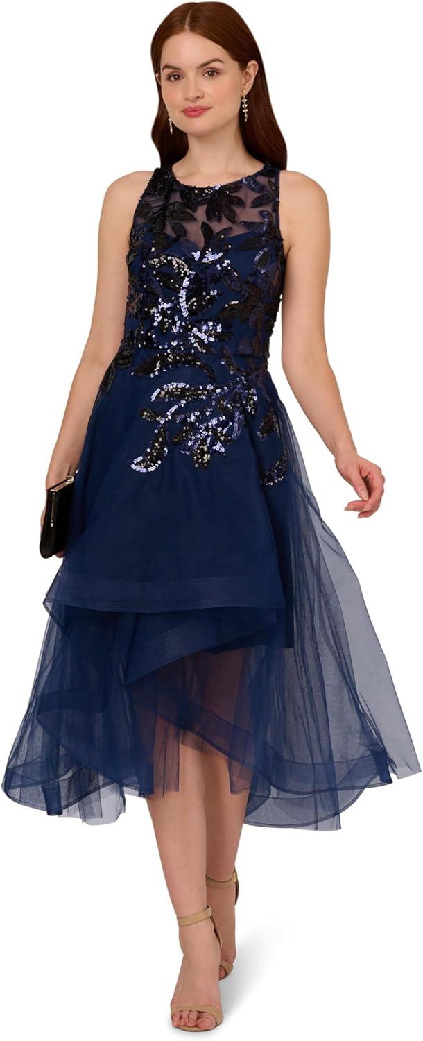 Inspire your next night out with this floral beaded dress. This midi dress features a sleeveless bodice, a crew neckline with illusion details that give the appearance of a sweetheart neckline, and a horsehair skirt hem. Designed with tulle fabric that is adorned with sequin beading from the shoulder to the hips, this high low dress is a beautiful choice for a cocktail attire event or formal wedding. Styled with nude high heels and a matching clutch, this unique beaded dress will elevate your plans.