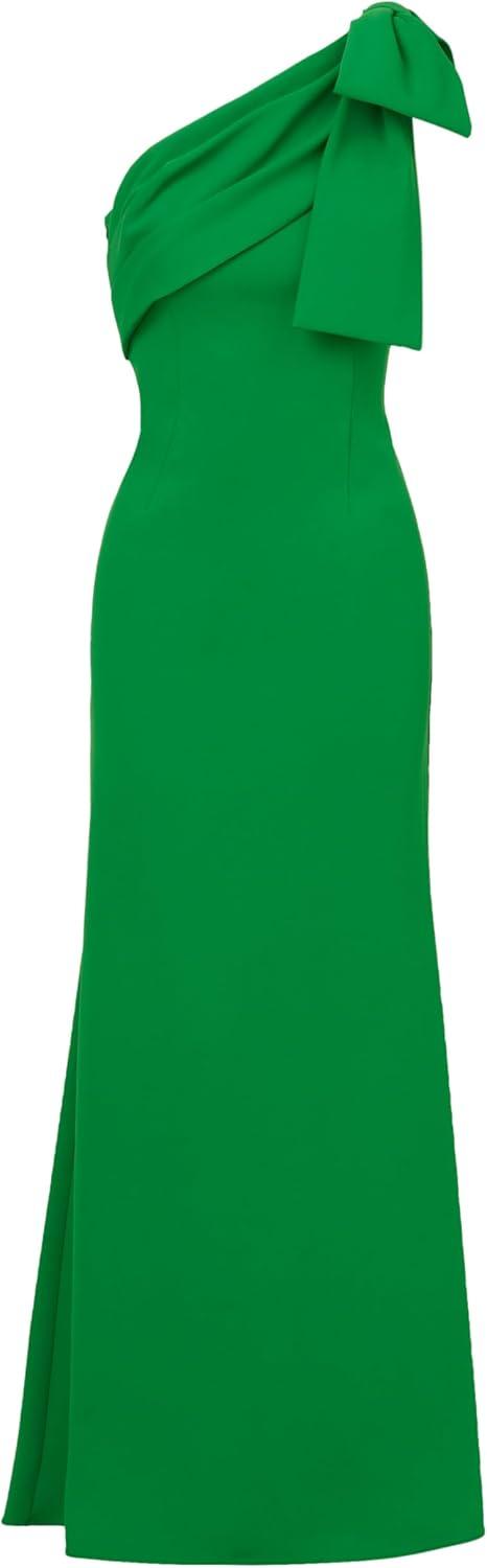 Modern fabrication elevates this classic formal dress for an unforgettable look. This mermaid gown is all about the drama. Featuring a fitted bodice and mermaid skirt, the one shoulder neckline of this gown steals the show boasting pleated details and a large bow accent. Crafted from stretch crepe, this formal dress has no waist seam for an ultra-comfortable look. Styled with nude heels and beaded clutch, this one shoulder gown was made for a black-tie affair.